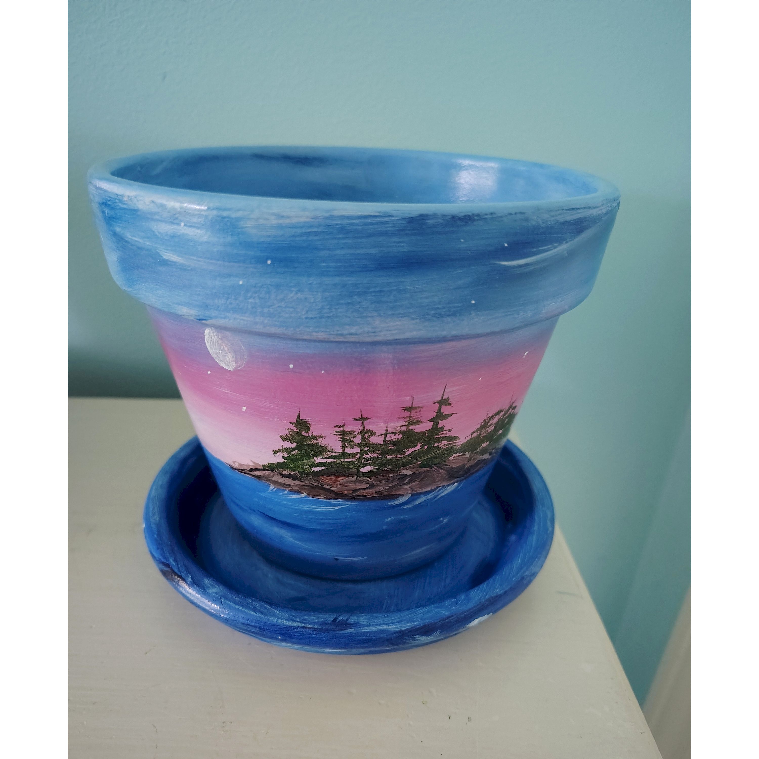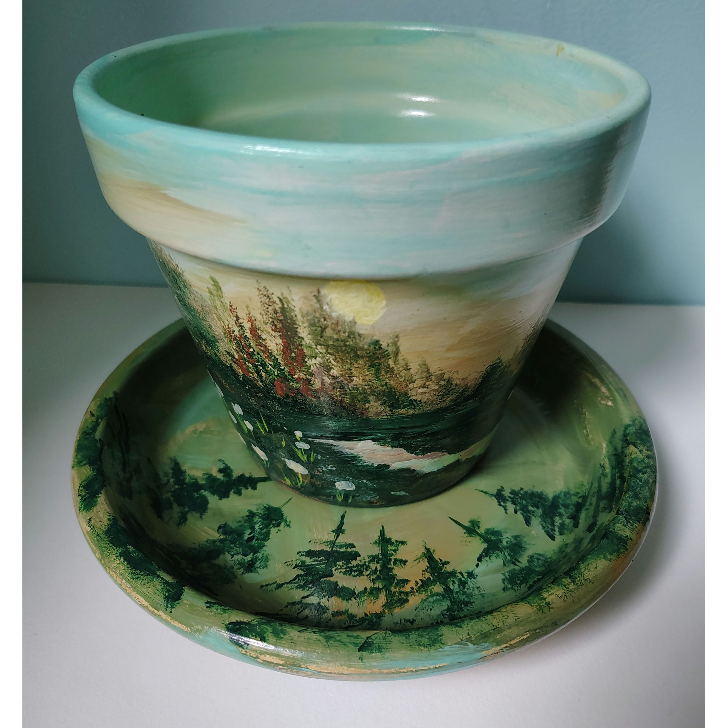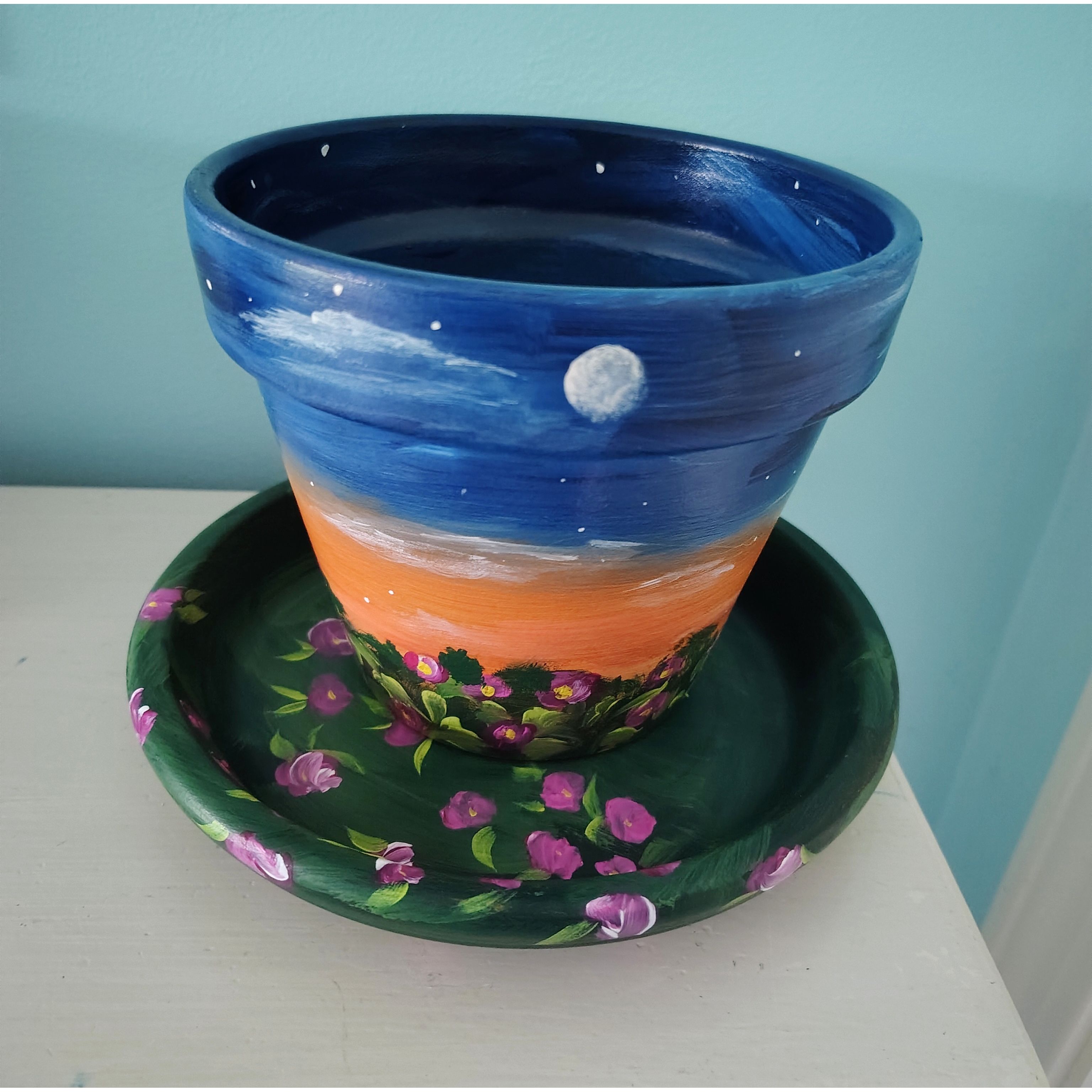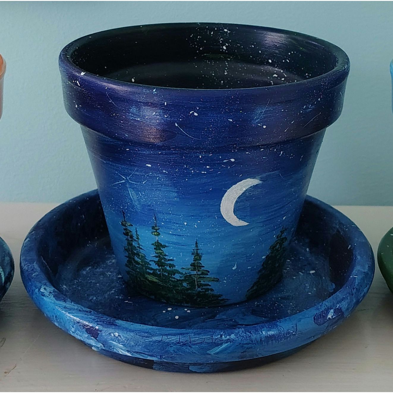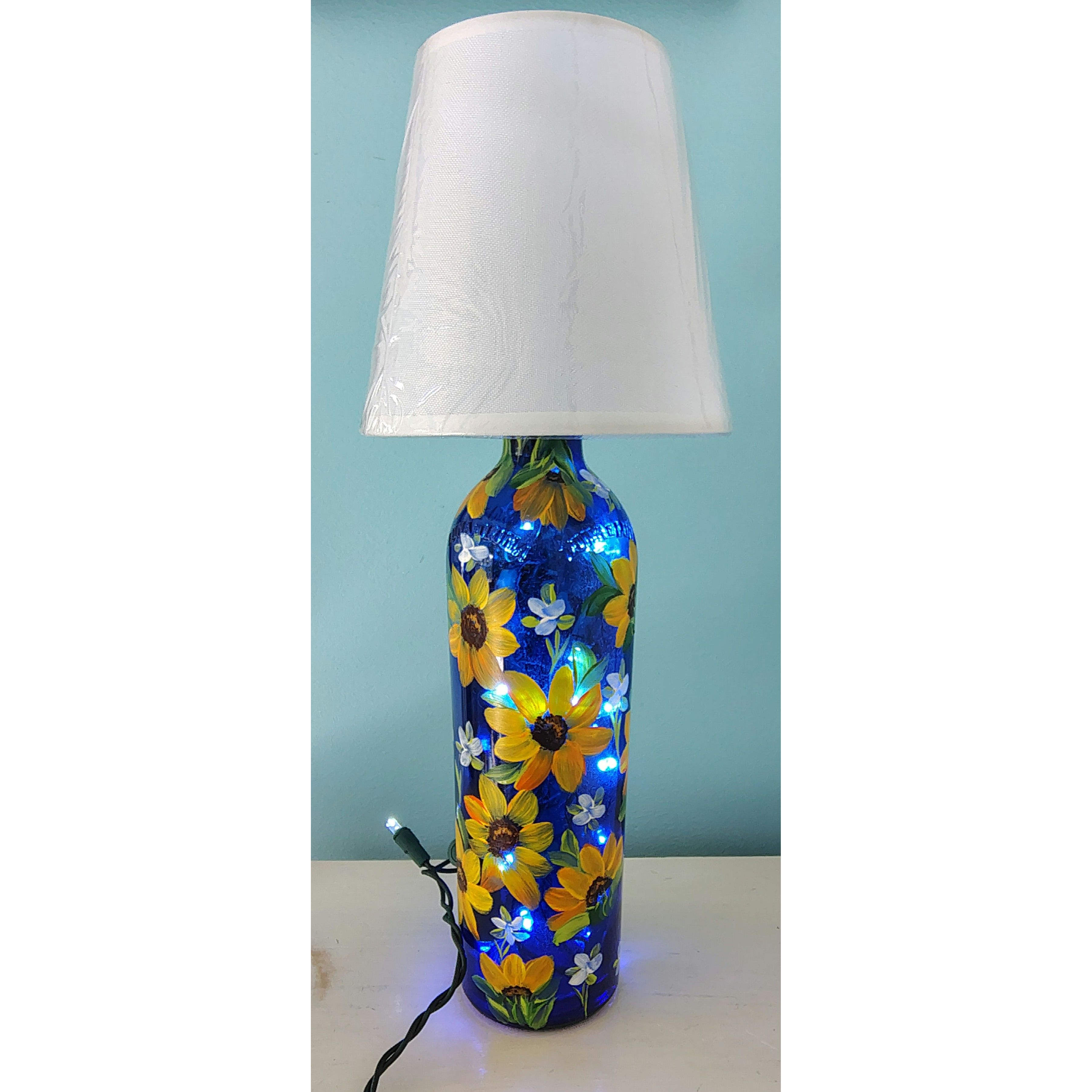 I specialize in hand painted glassware, lighted bottle lamps and clay pots. Florals and landscapes are my best designs.