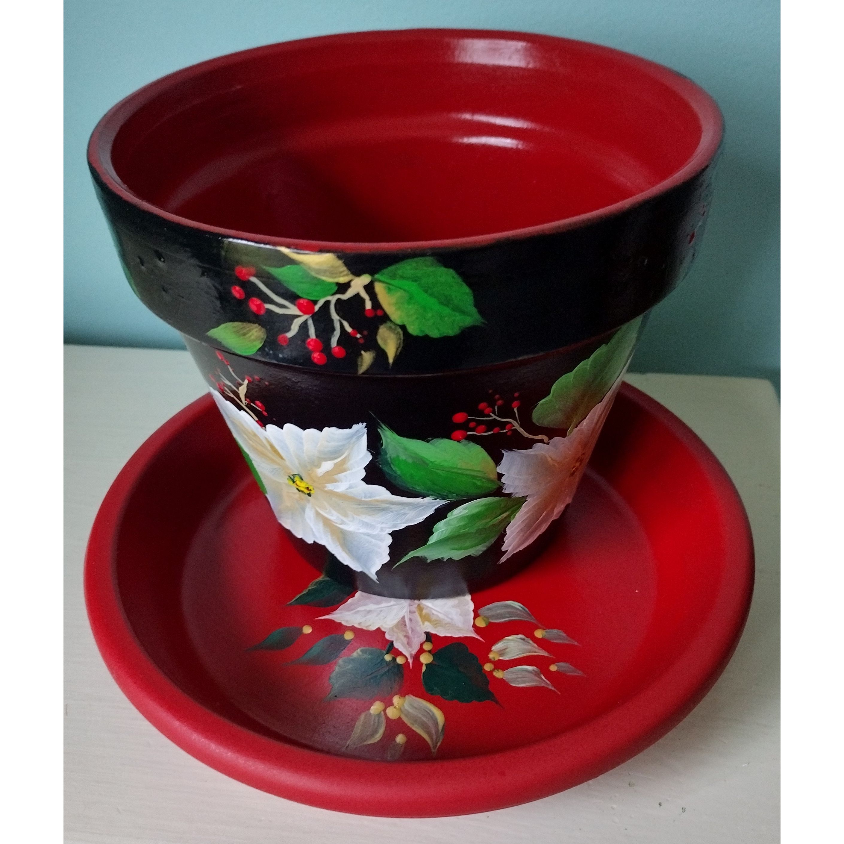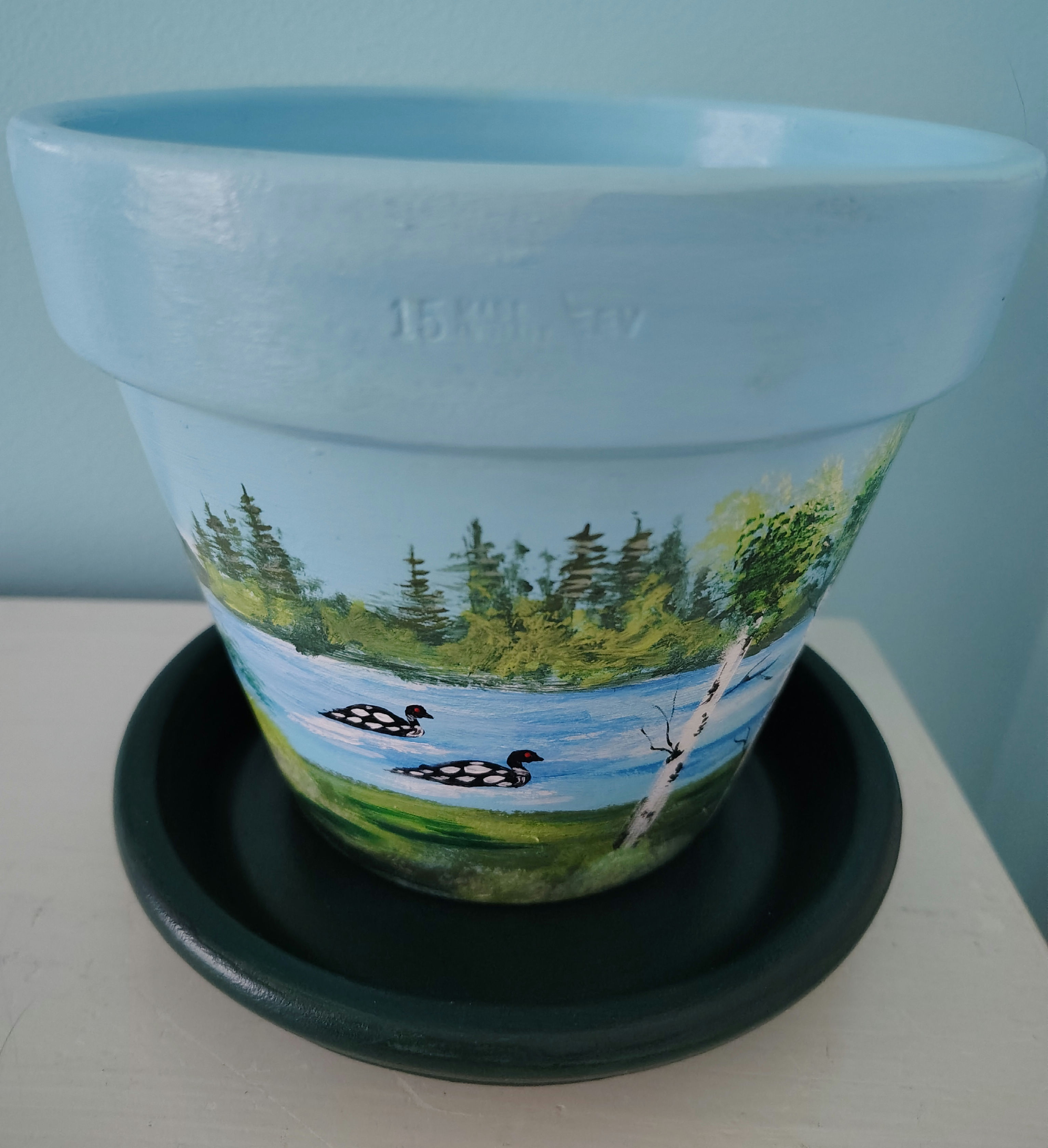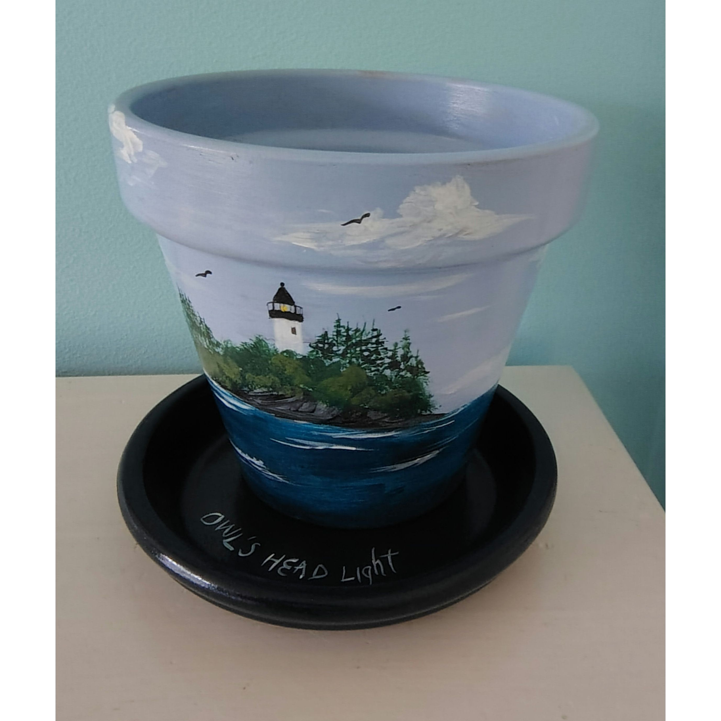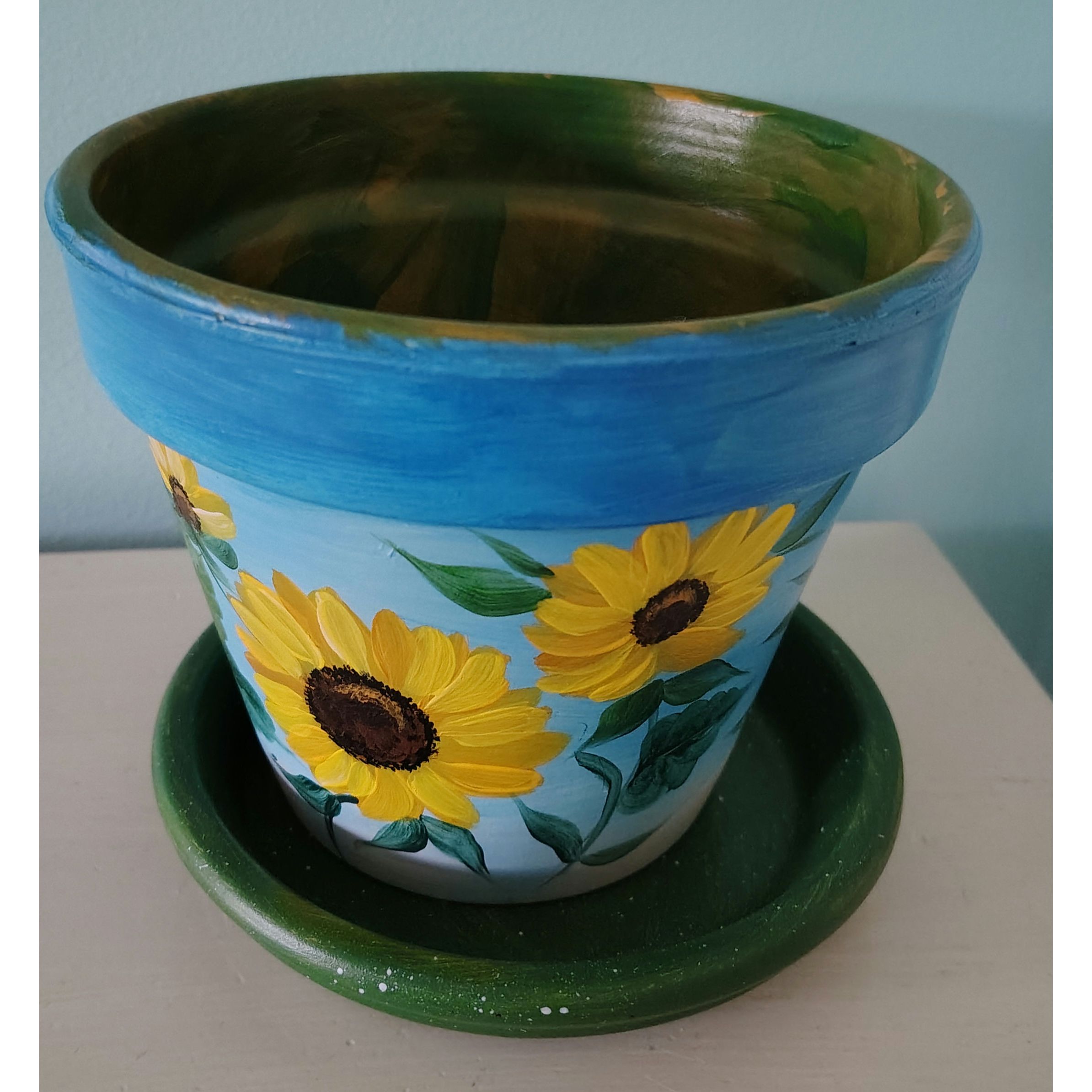 I specialize in hand painted glassware, lighted bottle lamps and clay pots. Florals and landscapes are my best designs.