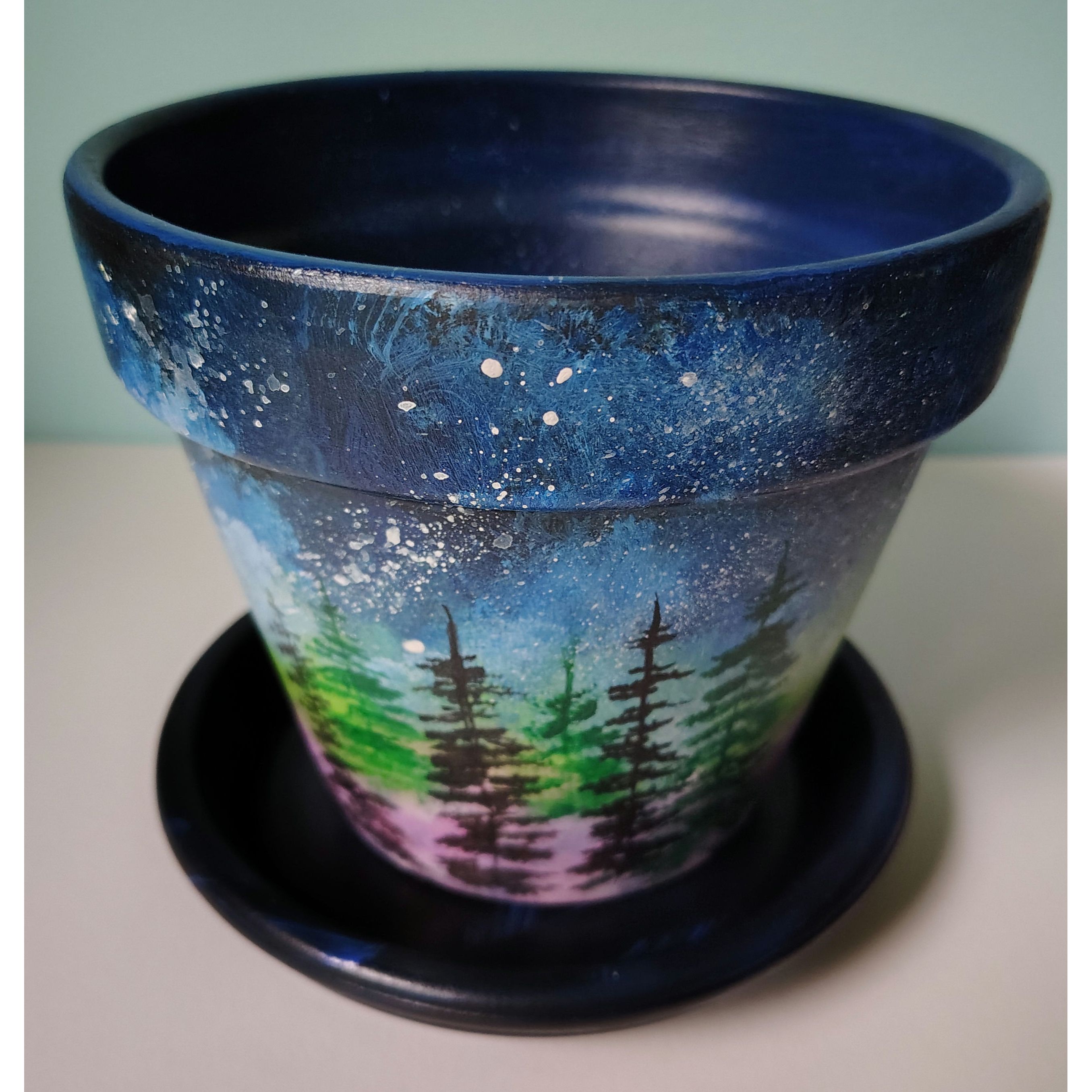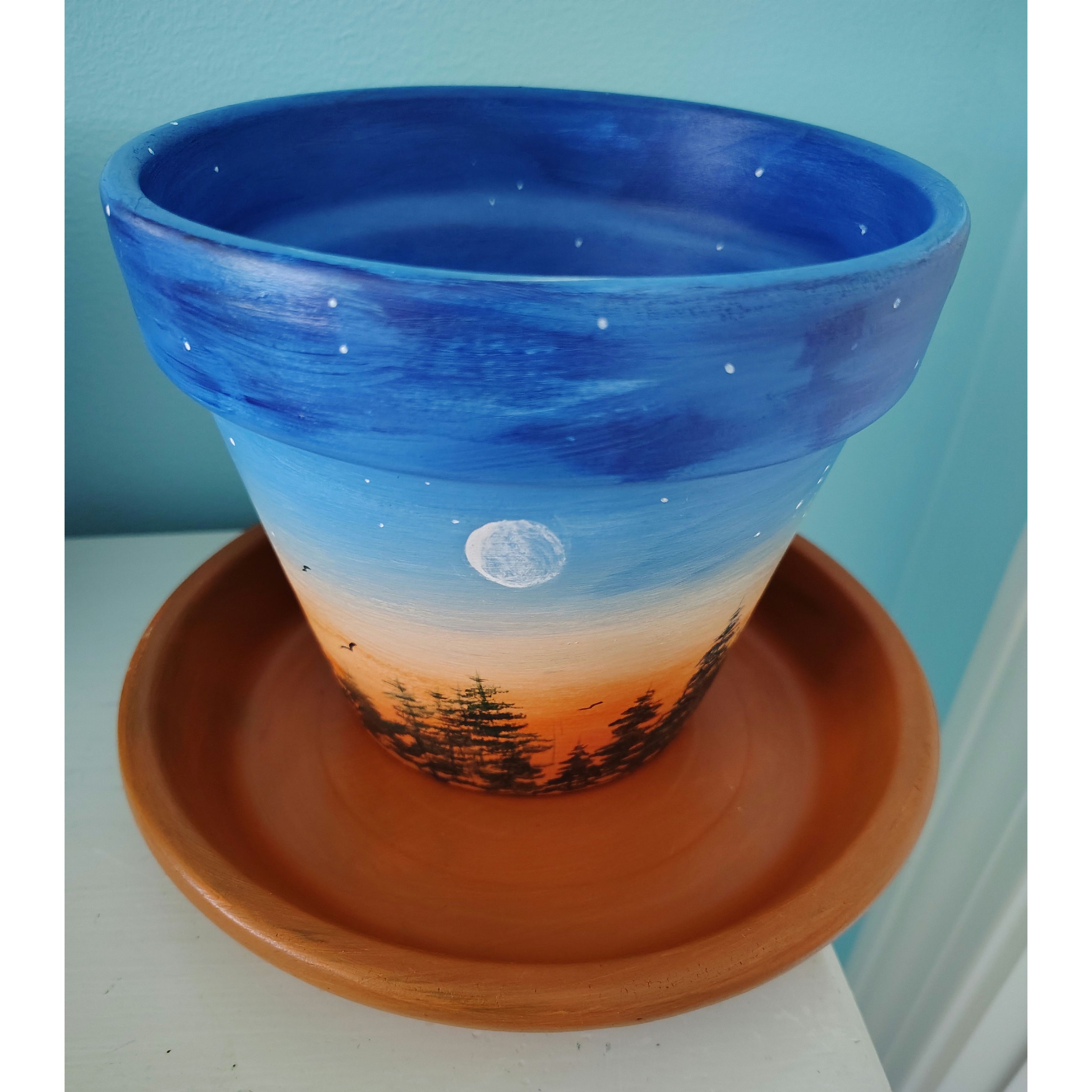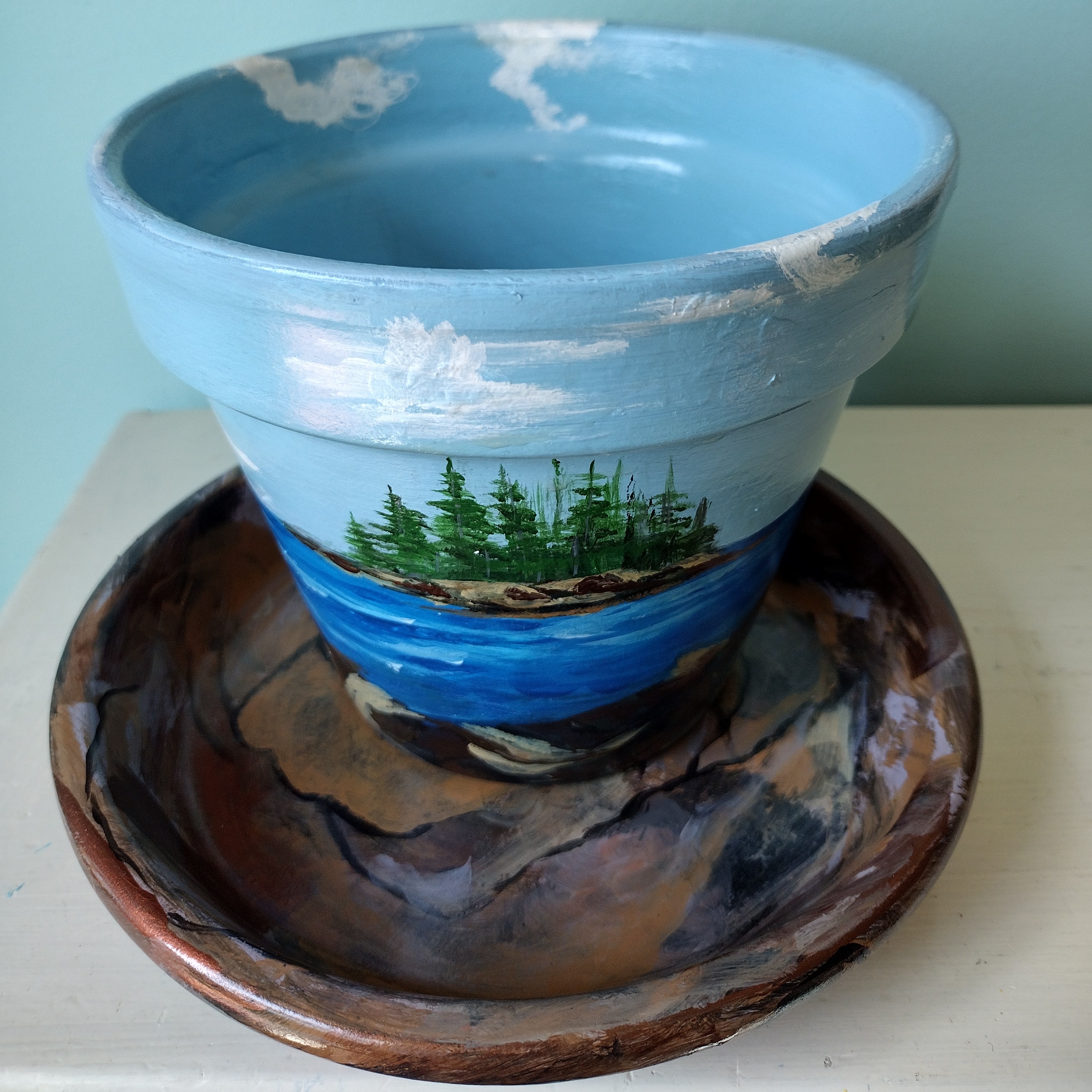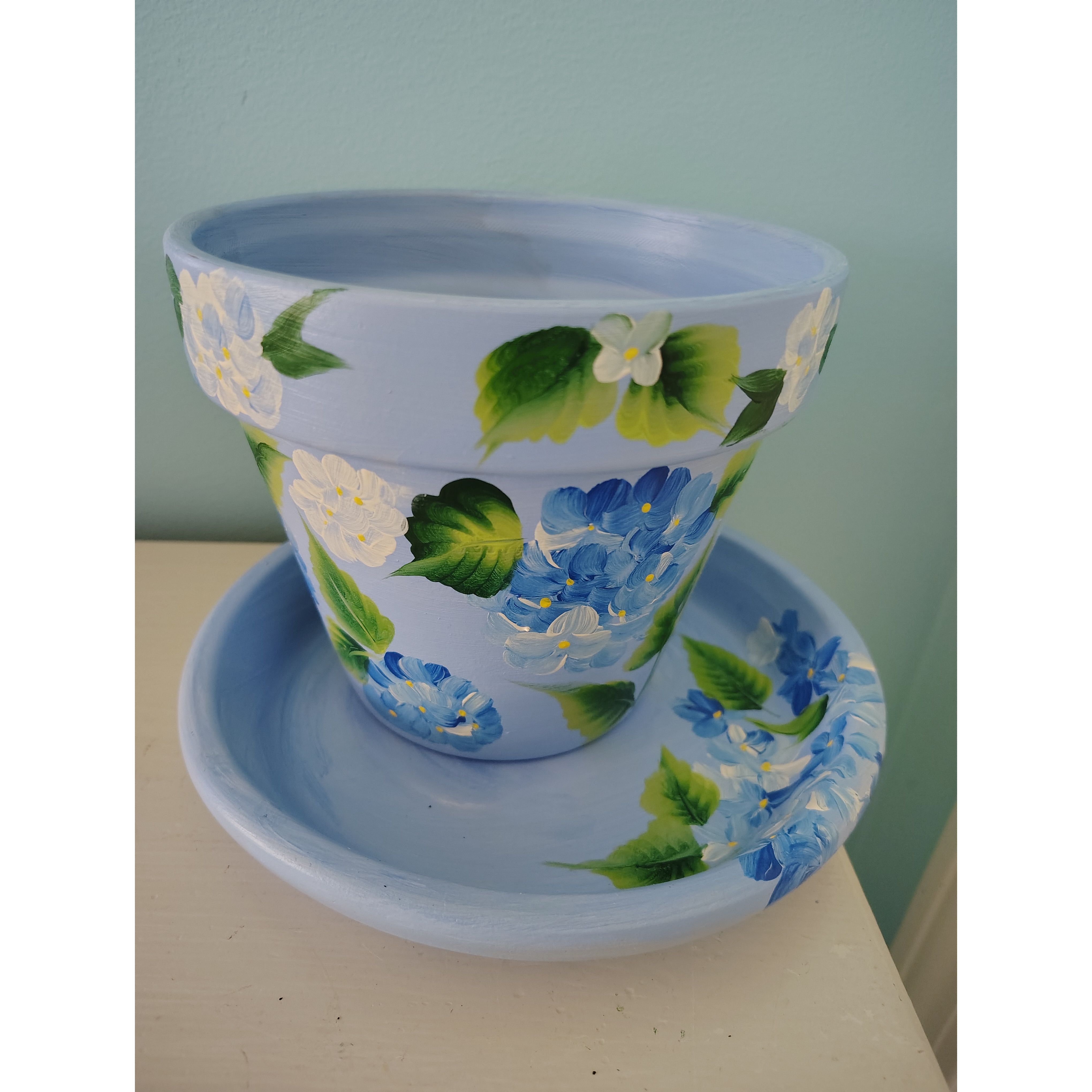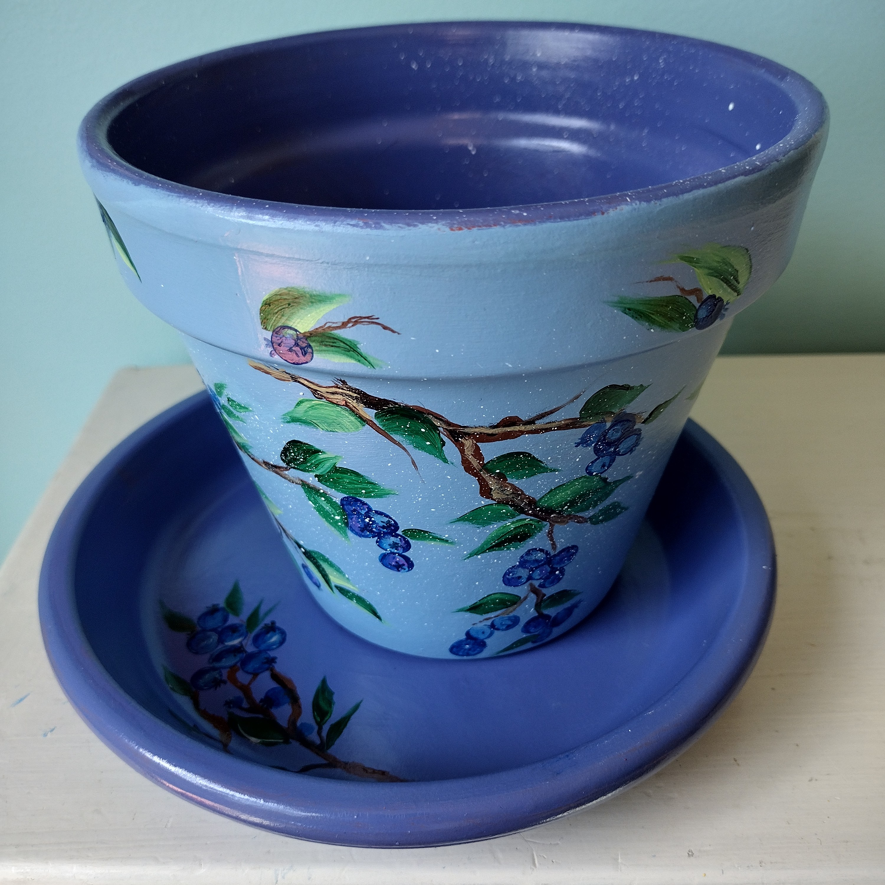I specialize in hand painted glassware, lighted bottle lamps and clay pots. Florals and landscapes are my best designs.