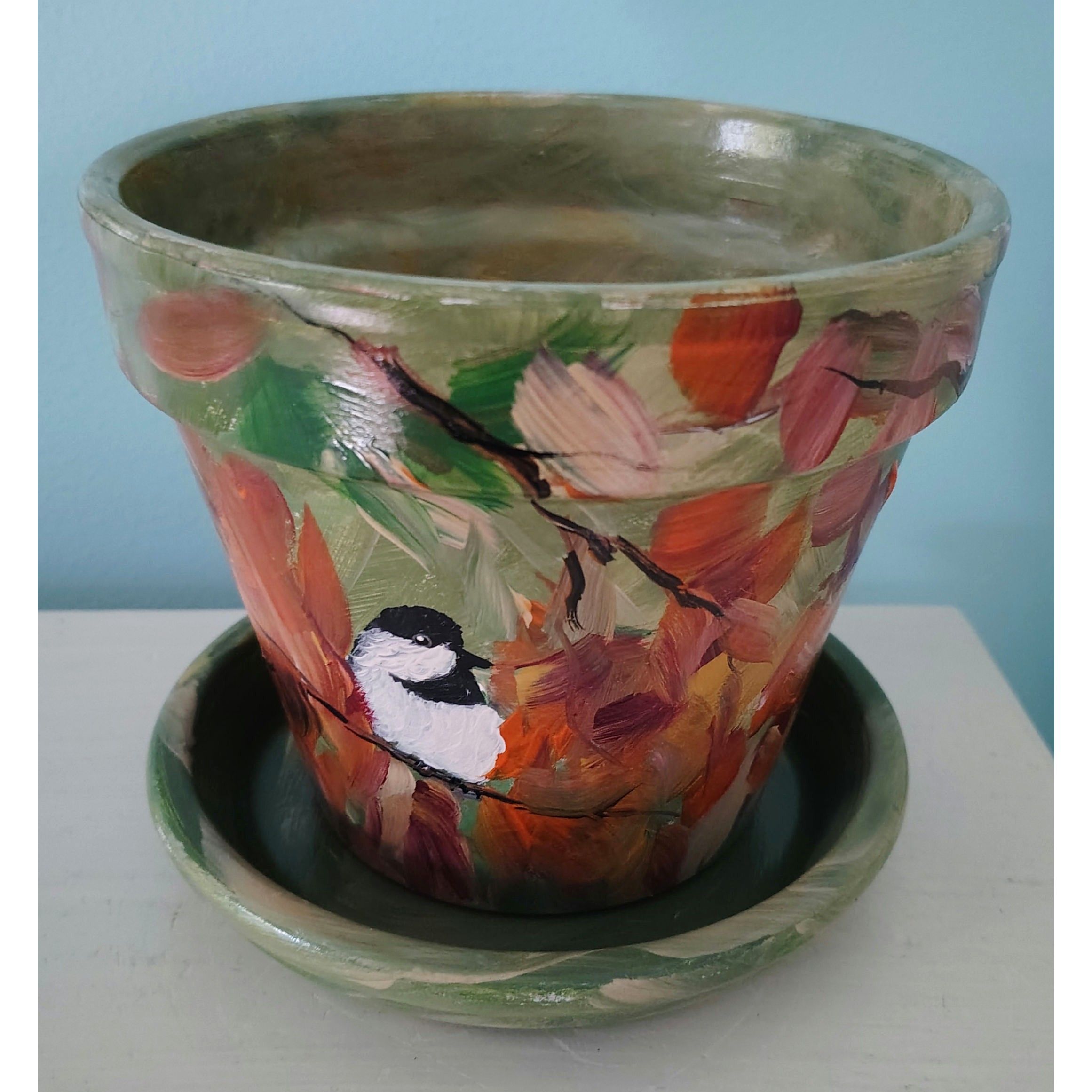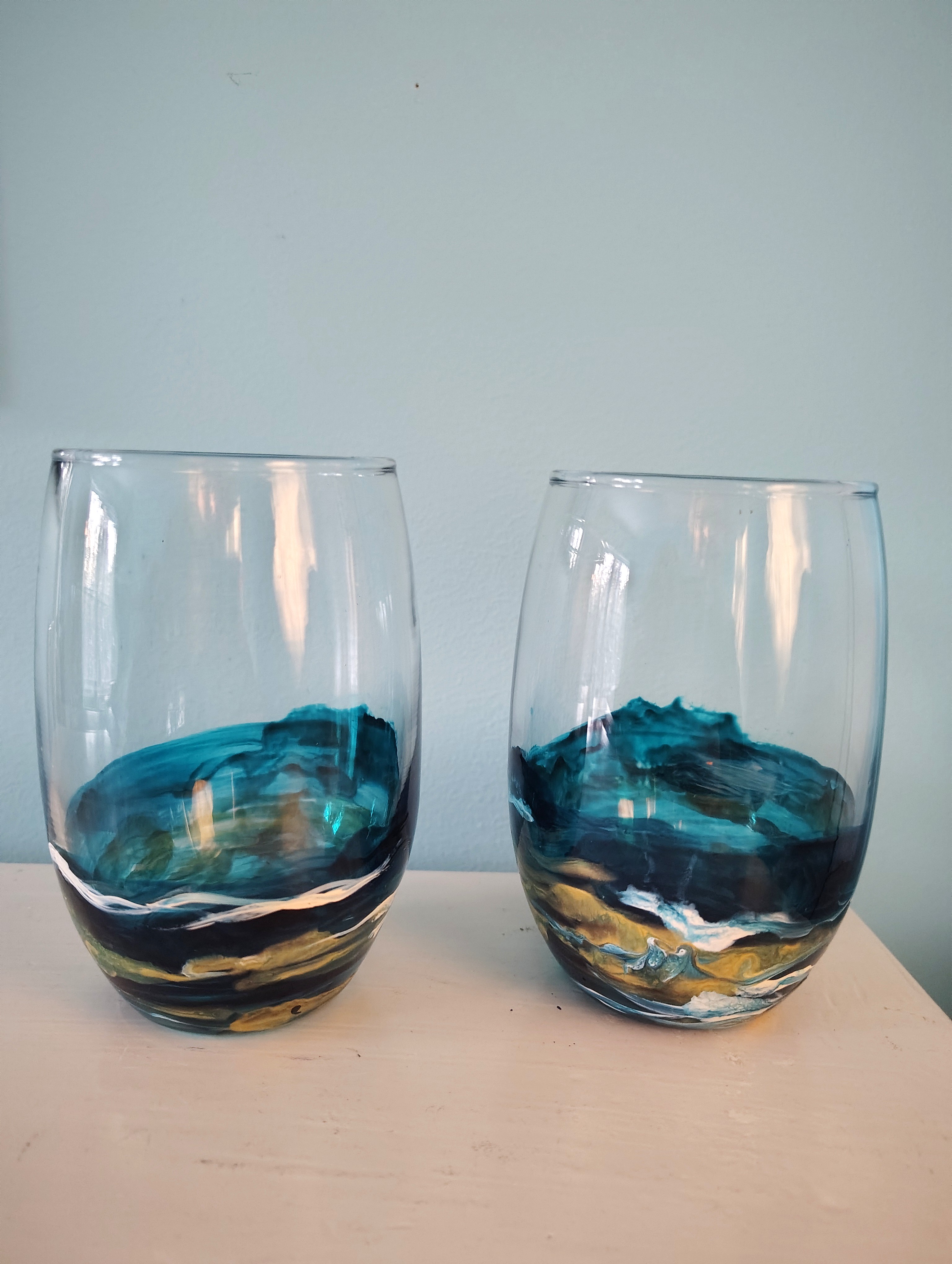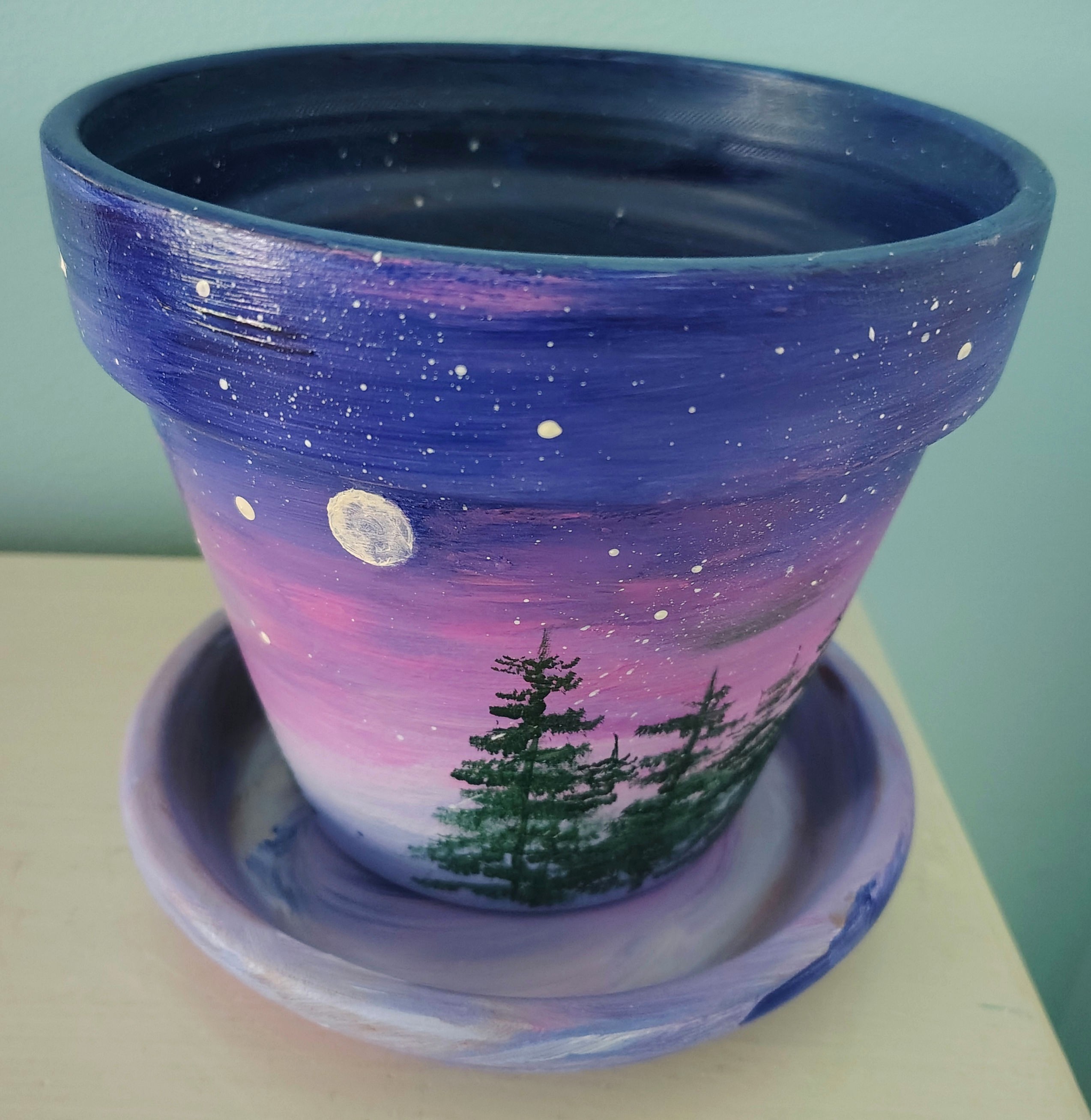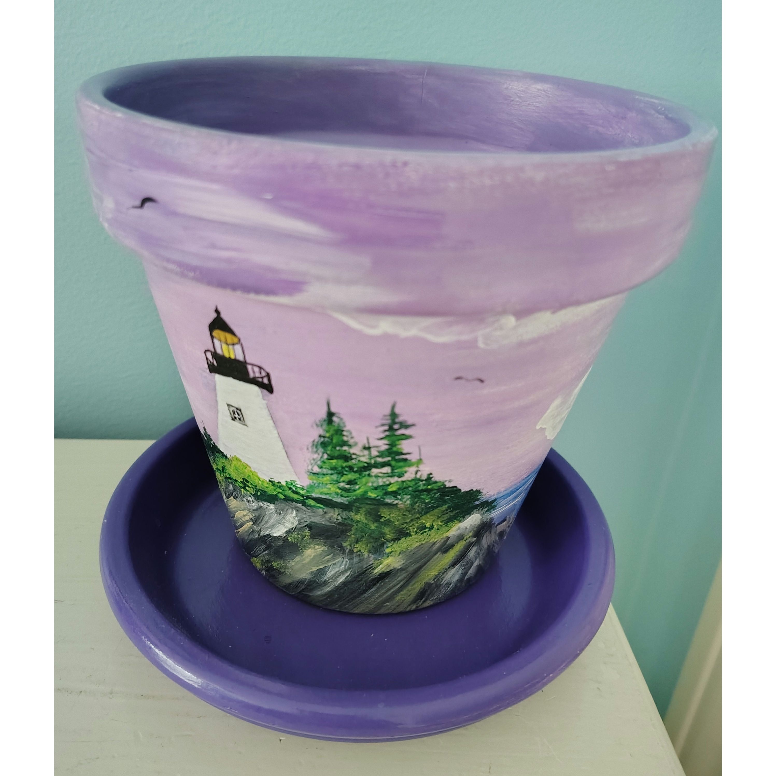 I specialize in hand painted glassware, lighted bottle lamps and clay pots. Florals and landscapes are my best designs.
